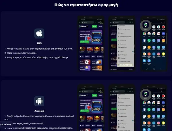 Υποστηρίζουμε παιχνίδι από κινητό με δύο τρόπους: έναν responsive ιστότοπο στον browser και ειδικές εφαρμογές για iOS και Android. Η browser έκδοση διατηρεί τα ίδια βασικά μενού, συμπεριλαμβανομένων του ταμείου, των προωθήσεων και των φίλτρων παιχνιδιών, ώστε να μπορείτε να αλλάζετε συσκευή χωρίς να μαθαίνετε νέο layout. Για χρήστες εφαρμογής, η εφαρμογή Spinko είναι σχεδιασμένη για γρήγορη πρόσβαση σε κατηγορίες παιχνιδιών και εργαλεία λογαριασμού, με πλοήγηση που έχει στηθεί για μικρότερες οθόνες.