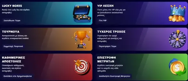 | Καθημερινό VIP Cashback | Έως 35% cashback στις καθαρές ζημιές της προηγούμενης ημέρας | Το ποσοστό εξαρτάται από το επίπεδο loyalty· πιστώνεται βάσει καθαρών αποτελεσμάτων |