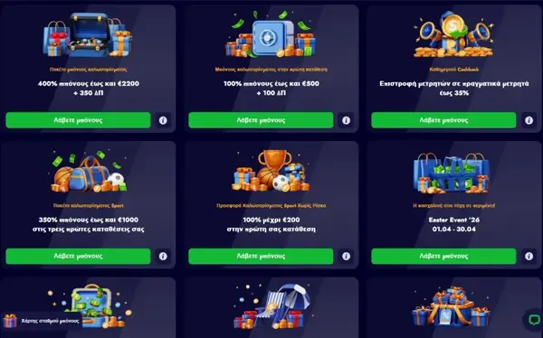 Το SpinkoCasino εμφανίζει τις προσφορές στην ενότητα Promotions, όπου μπορείτε να ανοίξετε κάθε μπόνους για να διαβάσετε τους πλήρεις όρους πριν κάνετε opt-in. Οι κανόνες μπόνους μπορεί να περιλαμβάνουν ελάχιστες καταθέσεις, απαιτήσεις τζιραρίσματος και χρονικά όρια, οπότε προτείνουμε να ελέγχετε τις λεπτομέρειες πριν ξεκινήσετε. Για ελληνικούς λογαριασμούς, η βασική αρχική προσφορά είναι ένα πακέτο καλωσορίσματος με βάση την κατάθεση και επίσης τρέχουμε reload deals και cashback μέσω της δομής loyalty. Αν αναζητάτε Spinko casino μπόνους χωρίς κατάθεση, συγκρίνετέ το προσεκτικά με τις διαθέσιμες προσφορές για Ελλάδα, επειδή τα ενεργά welcome deals εδώ βασίζονται σε καταθέσεις και όρους τζιραρίσματος.