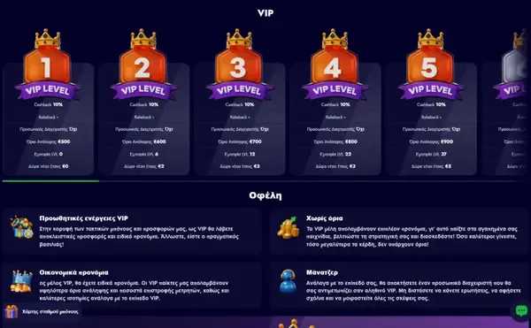 Το VIP σύστημά μας βασίζεται σε δομή loyalty 30 επιπέδων, σύμφωνα με τον συνολικό όγκο τζιραρίσματος. Καθώς ανεβαίνετε επίπεδα, τα προνόμια μπορούν να βελτιώνονται, όπως υψηλότερα ποσοστά cashback και ειδικά δώρα, όπως τα πρωτοχρονιάτικα δώρα που αναφέρονται για τα επιλέξιμα επίπεδα. Τα υψηλότερα επίπεδα loyalty μπορούν επίσης να ξεκλειδώσουν VIP μεταχείριση με πιο εξατομικευμένη υποστήριξη. Επειδή η πρόοδος συνδέεται με τον όγκο τζιραρίσματος, προτείνουμε να ορίσετε πρώτα ένα budget και να χρησιμοποιείτε όρια αν χρειάζεται, ειδικά κατά τη διάρκεια ενεργών προωθήσεων. Πολλοί παίκτες που δοκιμάζουν το Spinko ξεκινούν από το βασικό επίπεδο και στη συνέχεια αποφασίζουν αν το επιπλέον cashback και τα οφέλη υπηρεσιών ταιριάζουν στο στυλ παιχνιδιού τους.